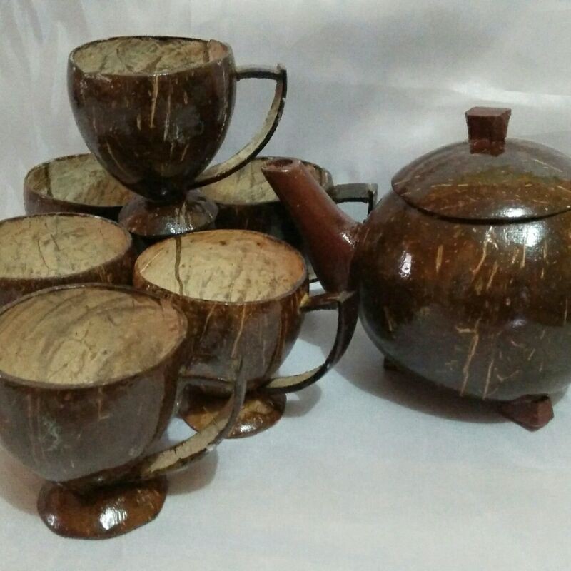 Bahan tempurung kelapa, bisa untuk minum,kopi dan teh ,karena tidak menggunakn paku ,, cukup di cuci dulu dngn air panas, 1 set isi 6 cangkir 1
