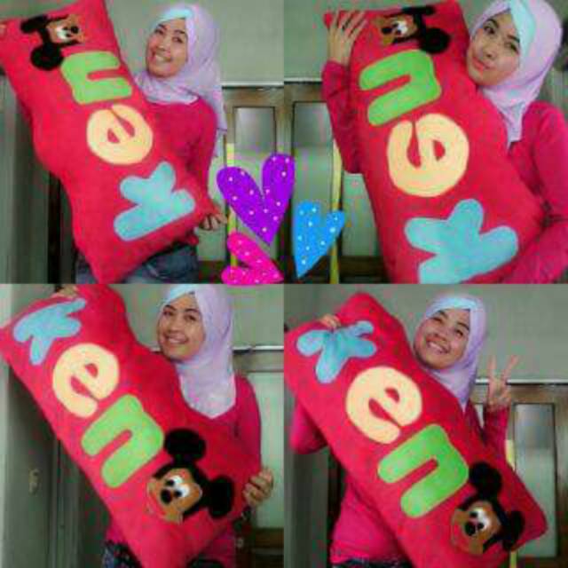 sebutkan warna bantal,warna huruf dan nama dibantal serta karakter
