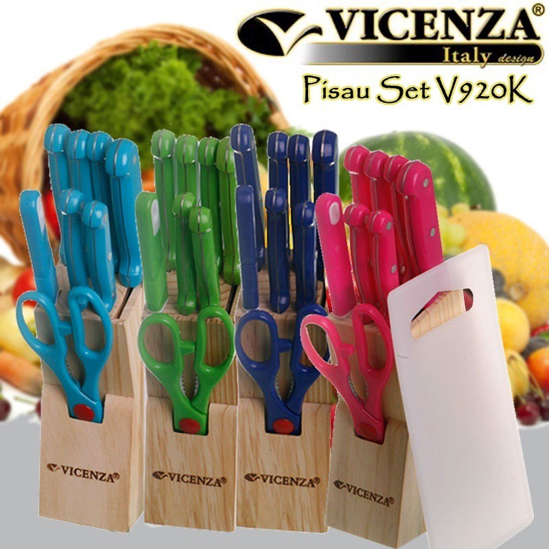 100% ORIGINAL VICENZA - Stainless Steel - Rak Kayu - Penyimpanan Praktis - Anti Karat - Desain Ergonomis Material Stainless Steel Vicenza Pisau menggunakan material stainless steel untuk pisaunya. Material ini membuat produk menjadi anti karat sehingga mudah dibersihkan. Anti karat juga membuat produk menjadi tahan lama sehingga Anda tidak perlu membeli barang yang sama dalam waktu dekat. Set Pisau Produk ini merupakan set pisau yang terdiri dari 6 buah pisau 1 buah Pengupas 1 buah gunting 1 buah rak kayu juga 1 buah talenan. Rak kayu yang disediakan akan membantu Anda dalam menyimpan pisau-pisau tersebut jadi Anda tidak perlu bingung untuk menyimpan pisau-pisau ini. Gunting juga disediakan ketika Anda membutuhkannya untuk membuka berbagai kemasan makan. Sementara talenan juga termasuk di dalamnya sebagai wadah saat Anda memotong atau mengiris. Desain Ergonomis Vicenza telah dikenal sebagai salah satu penghasil produk peralatan rumah tangga yang berkualitas. Untuk itu masalah desain tidak perlu dipertanyakan lagi. Vicenza Pisau Set ini menggunakan pegangan yang terbuat dari plastik dan terasa ergonomis saat Anda menggunakannya sehingga tangan Anda tidak akan terasa pegal saat memotong. Tentang Vicenza Dengan pengalaman lebih dari 13 tahun di bidang porselen Vicenza menyadari bagaimana memadukan fungsi dengan faktor keindahan ini merupakan tantangan utama. Vicenza memiliki begitu banyak ragam produk porselen. Setiap produk memiliki fitur dan kegunaan masing-masing. Perbedaan yang dapat terlihat jelas adalah dari segi bentuk dan jenis motif yang digunakan. Kilauan cahaya yang terpancar dari produk Vicenza memberikan kebebasan kreasi dalam mengartikan kata elegan untuk rumah Anda.