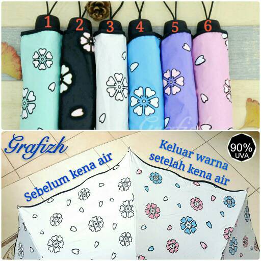 Berwarna ketika terkena air... Gagang kokoh. Payung bentuk mangkok, size besar untuk ukuran payung lipat, muat sampai 2 org.